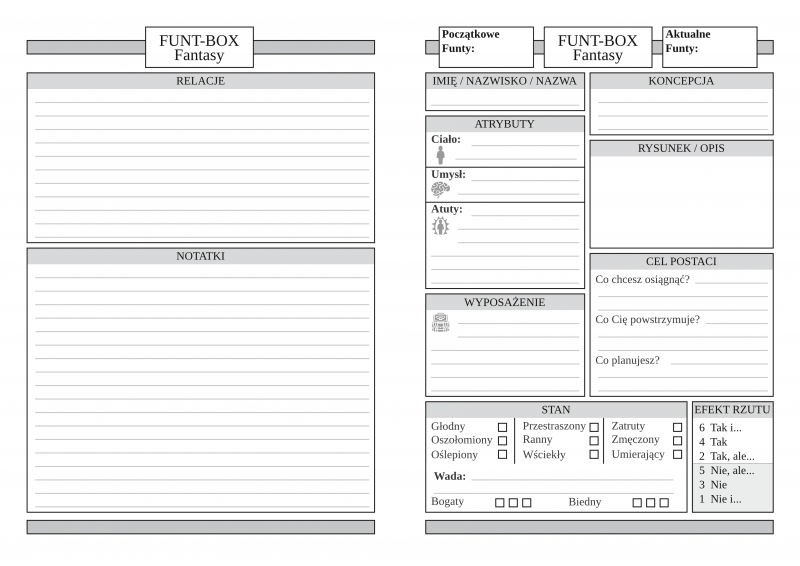 Czterostronna, składana karta postaci do systemu FUNTBOX FANTASY RPG.