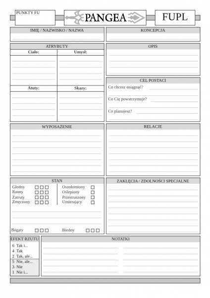 Dwustronna karta postaci dedykowana do gry w settingu "Pangea".