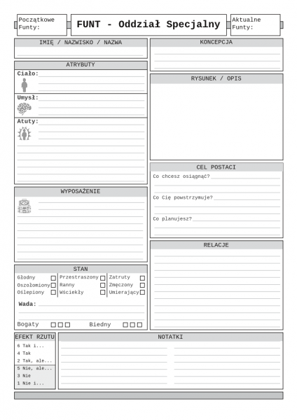 Dwustronna, dedykowana do settingu "Oddział Specjalny", karta postaci do systemu FUNT RPG.