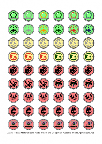 Plik zawiera żetony, które podczas gry mogą symbolizować przeciwników, pojazdy i zjawiska w przestrzeni kosmicznej. Zestaw przeznaczony jest do gry w settingach s-f. Żetony mają wielkość 23 mm, co pozwala na umieszczenie ich w kapslach numizmatycznych. Dwanaście zielonych żetonów, pozwala na wykorzystanie ich jako znaczników bohaterów. Na dwóch stronach pdf, znajduje się poza nimi 96 żetonów przeciwników, w różnych formach. Część z nich jest przedstawionych wielokrotnie, co umożliwia tworzenie "oddziałów" i grup. Na trzeciej stronie, umieszczona jest siatka heksagonalna dostosowana do ich wielkości.